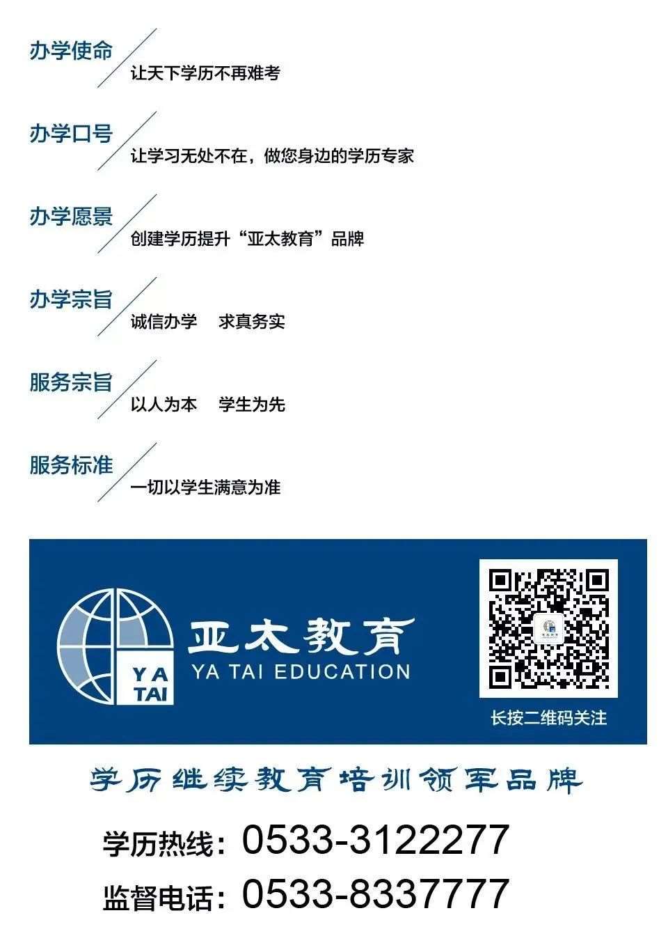 而淄博亚太教育,始终是你身后*靠谱的同行者。这些年,我们只专注一件事:为淄博本地在职人群,提供省心、靠谱、适配职场需求的学历提升解决方案。我们懂淄博本地的职场规则与学历需求,懂在职人时间紧、基础弱、怕麻烦的痛点,打磨出全流程陪伴式的教学服务,不用脱产、不耽误工作与家庭,从专业选校规划、考点精讲带学,到报考跟进、备考伴学,全程兜底,帮你把 “想提升” 的念头,变成 “拿得到” 的文凭,把学历短板,变成职场进阶的加分项。